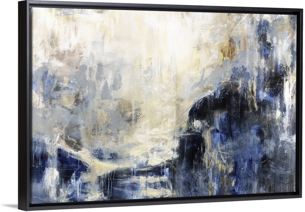<p>An abstract painting of cool colors of blue and gold.</p>