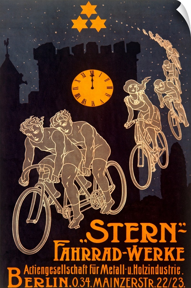 <p>Old advertising poster with trail of bicyclers with block tower silhouette in background.</p>