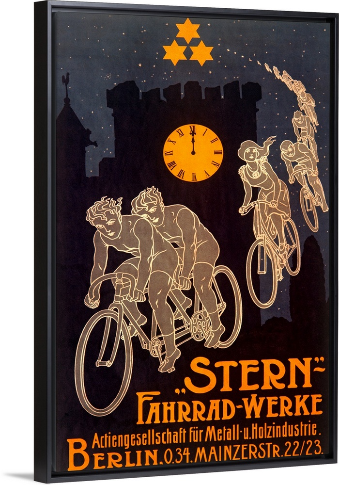 <p>Old advertising poster with trail of bicyclers with block tower silhouette in background.</p>