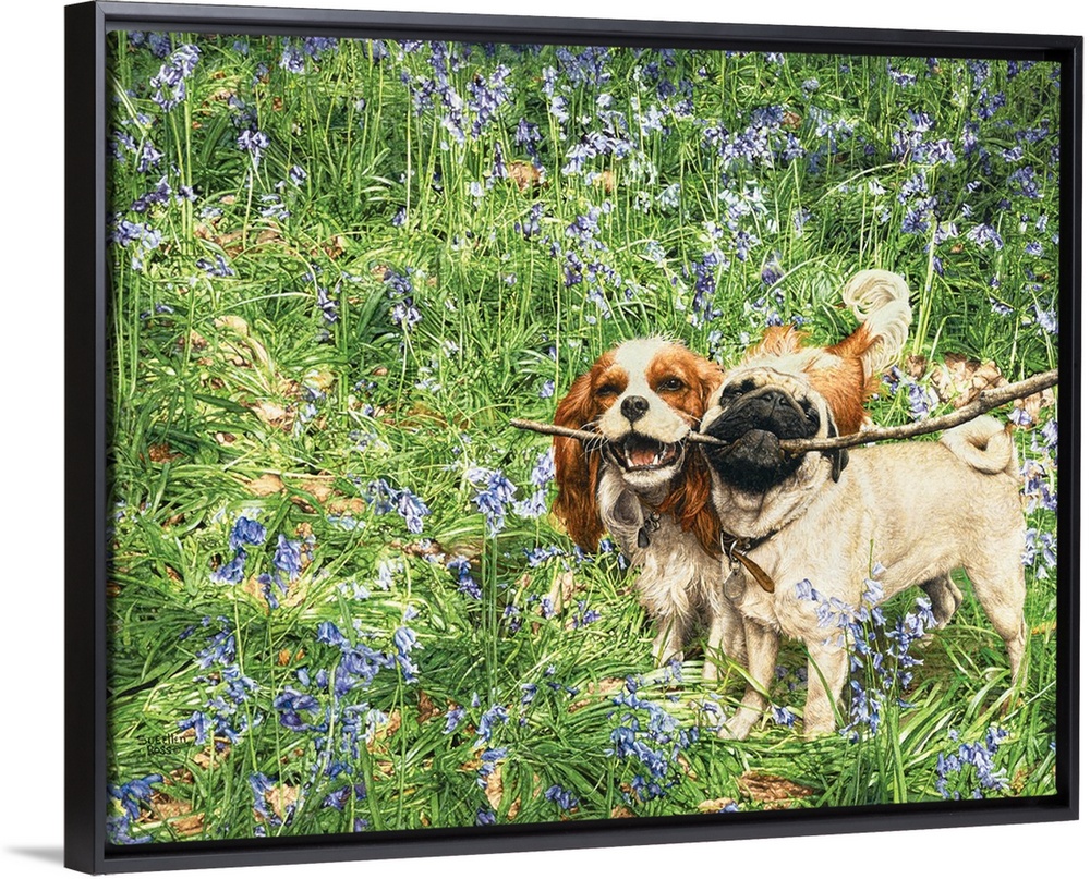 <p>A cute image of two dogs sharing a stick in a field of wild flowers.</p>