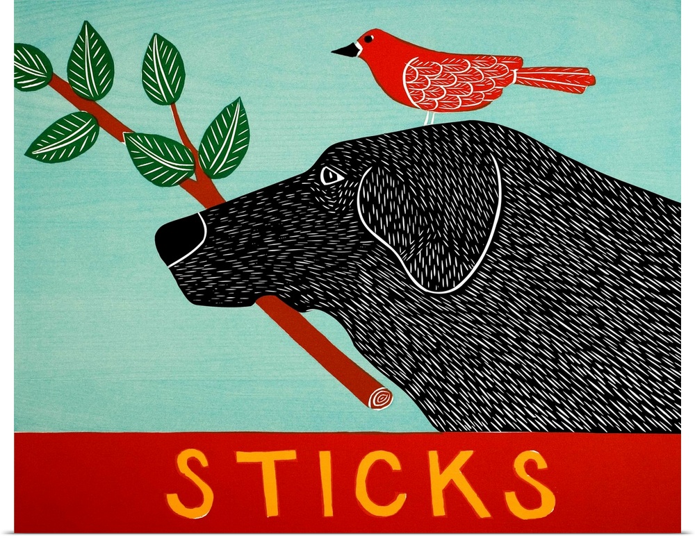 <p>Illustration of a black lab with a red bird standing on its head and a leafy stick in its mouth.</p>