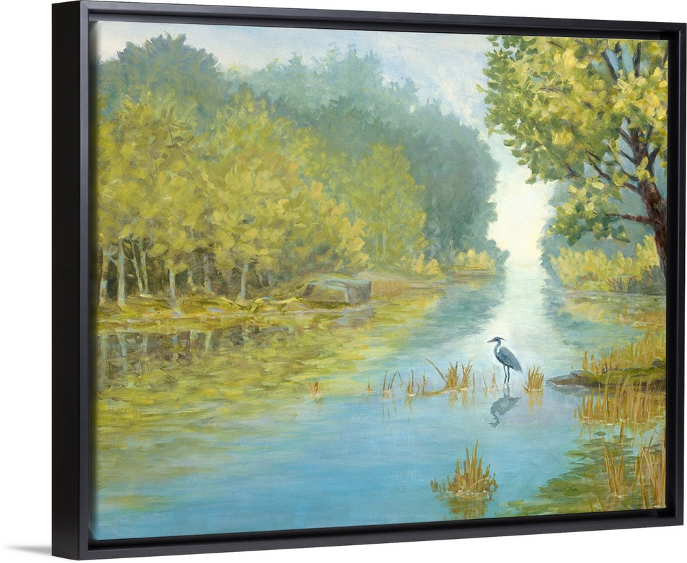 <p>Painting of a herons standing in a shallow river in a forest landscape.</p>