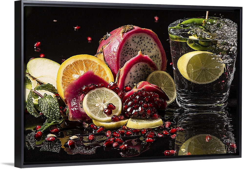 <p>Several tropical fruits composed together with a lemon splashing into a glass.</p>