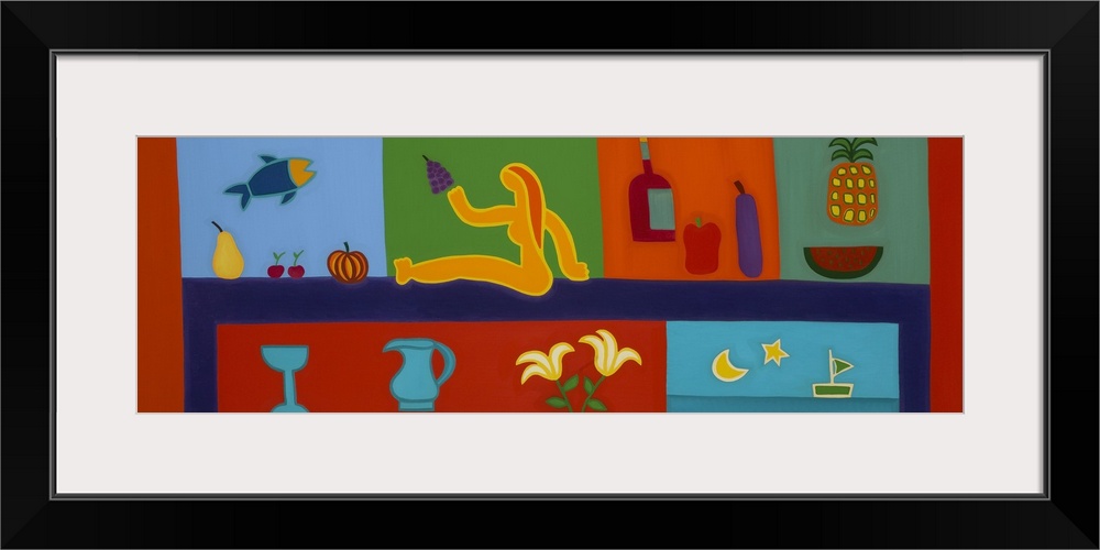 <p>Contemporary painting of a woman seated among fruit and silverware.</p>