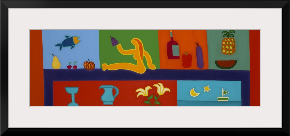 <p>Contemporary painting of a woman seated among fruit and silverware.</p>
