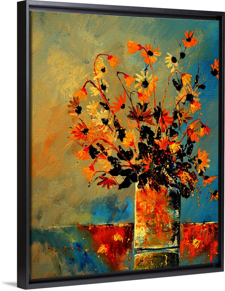 <p>Contemporary painting of a vase of orange flowers against a neutral backdrop.</p>