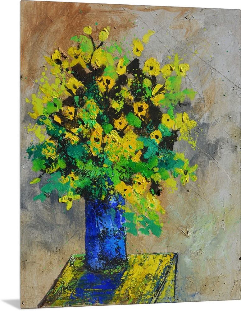 <p>A large bouquet of flowers in bright colors of green and yellow in a blue vase, against of neutral backdrop.</p>