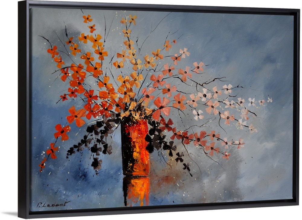 <p>A contemporary painting of a vase of autumn colored flowers.</p>