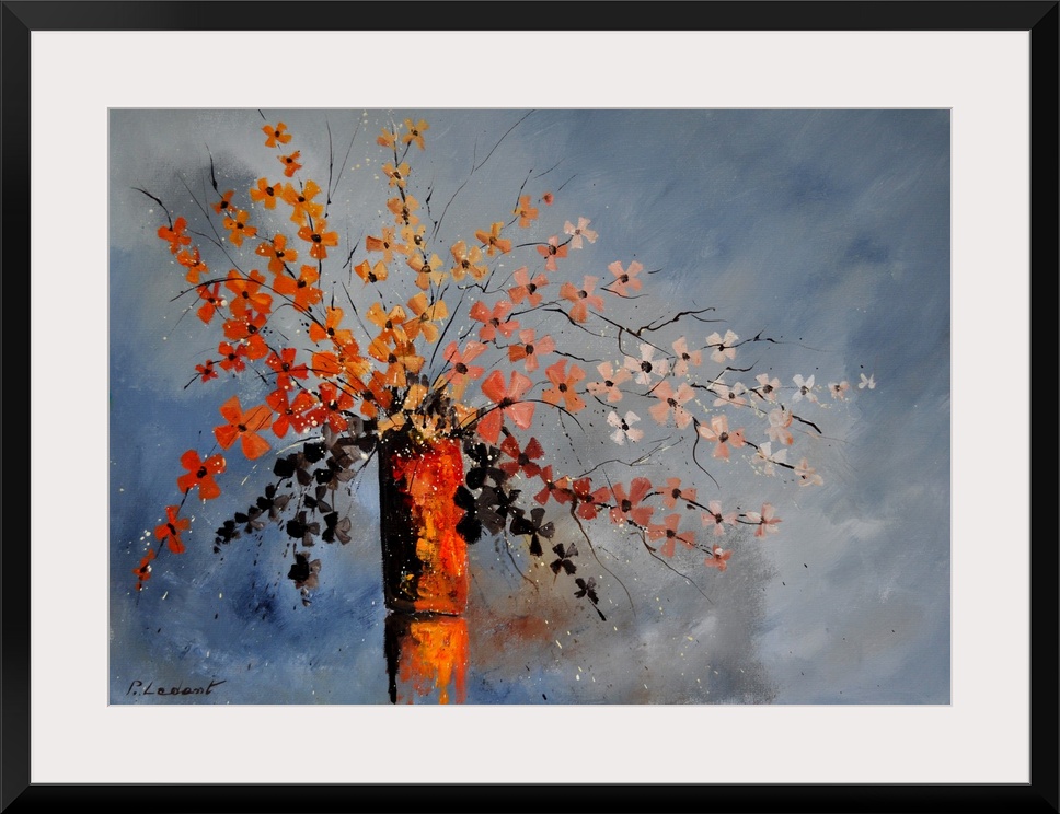 <p>A contemporary painting of a vase of autumn colored flowers.</p>