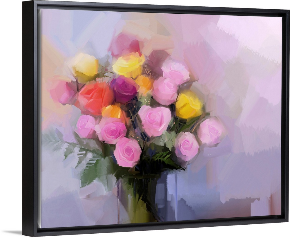<p>Still life a bouquet of flowers. Originally an oil painting red and yellow rose flowers in vase. Originally a hand painted floral in soft color and blurred style background.</p>