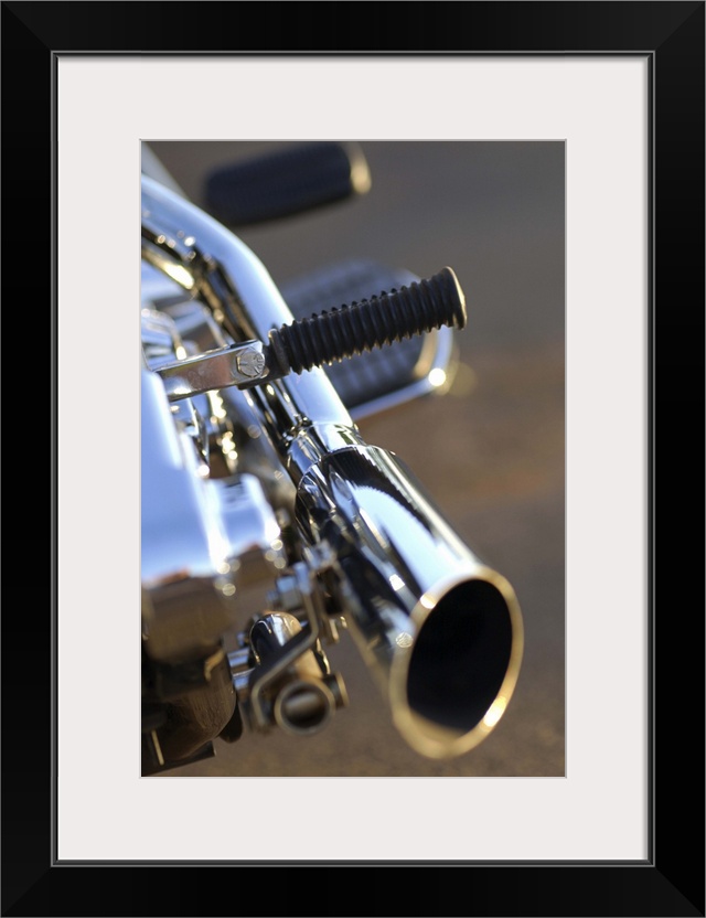 <p>Still-life close-up of a chrome tailpipe of a motorcycle</p>