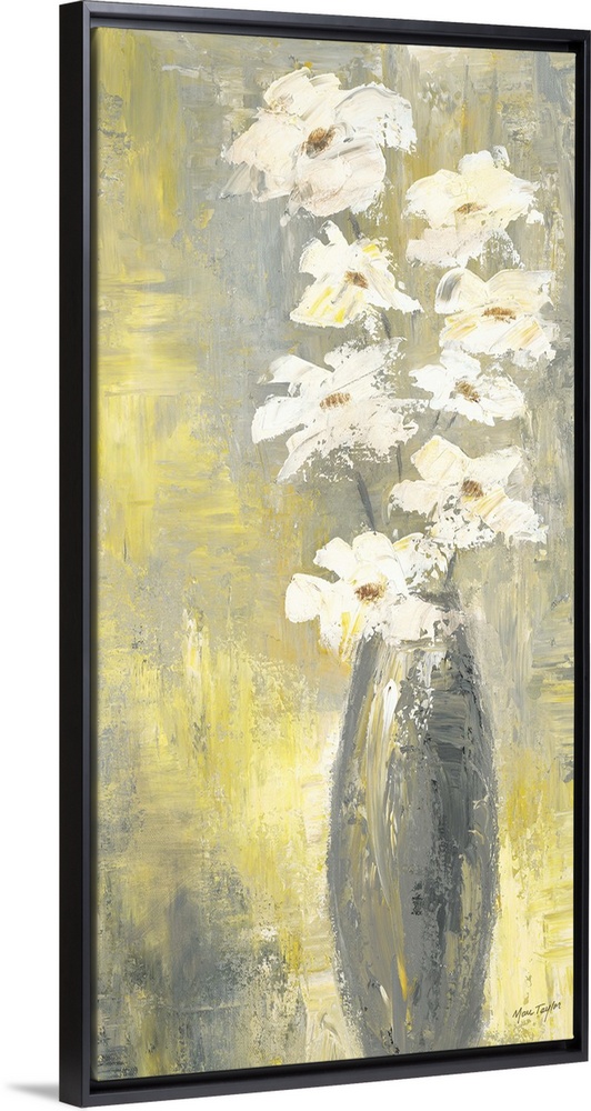 <p>Contemporary still life painting of white flowers in a thin vase.</p>