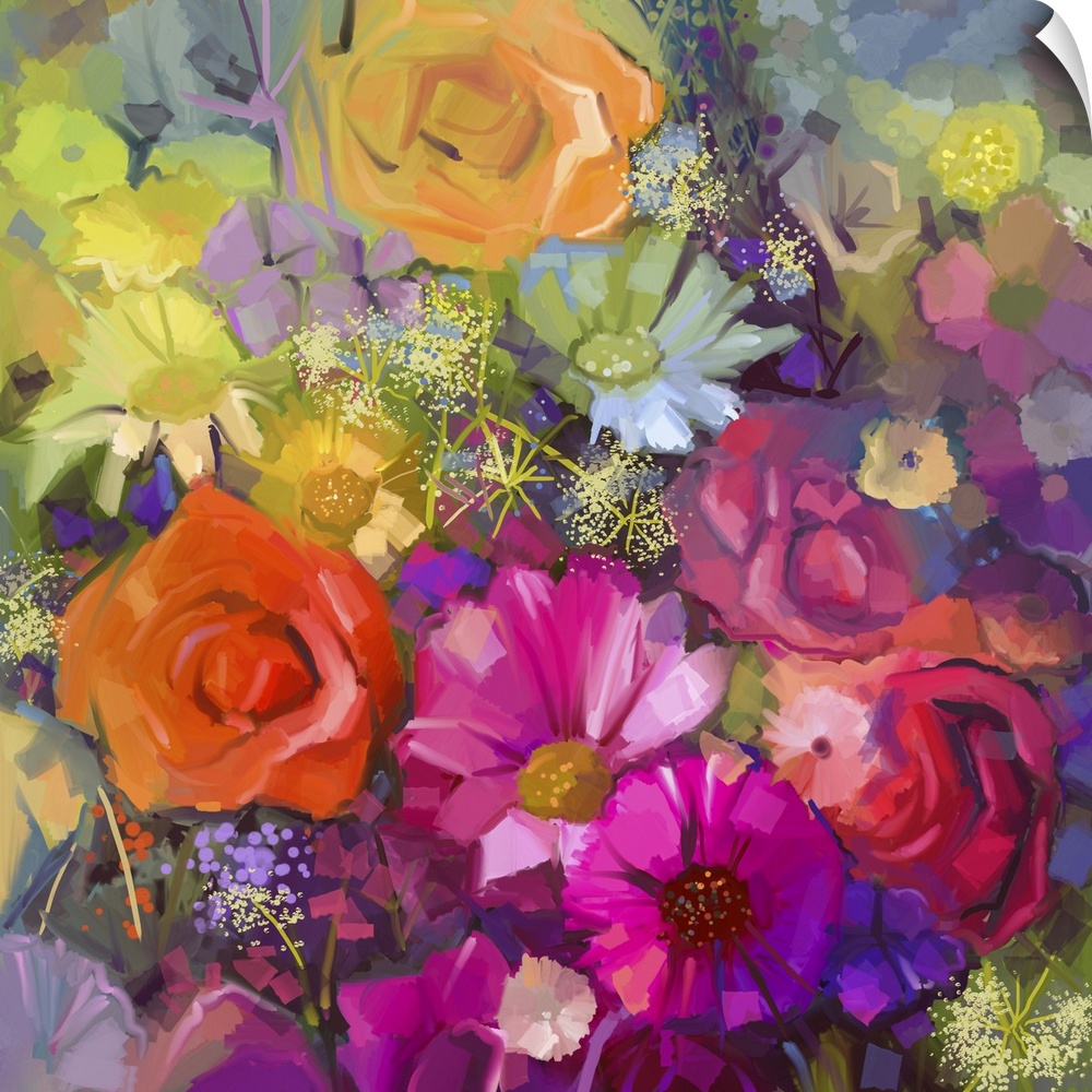 <p>Still life of yellow and red color flowers. Originally an oil painting a bouquet of rose, daisy and gerbera flowers. Originally hand painted floral impressionist style.</p>