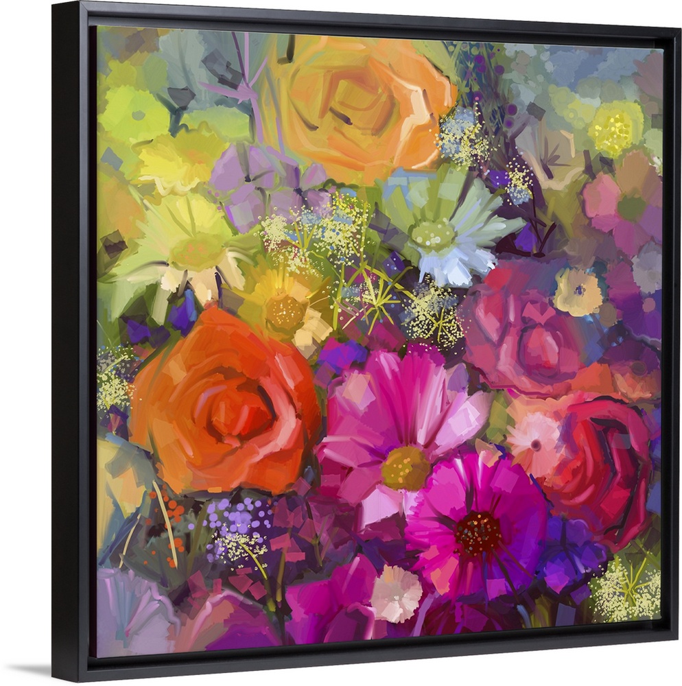 <p>Still life of yellow and red color flowers. Originally an oil painting a bouquet of rose, daisy and gerbera flowers. Originally hand painted floral impressionist style.</p>