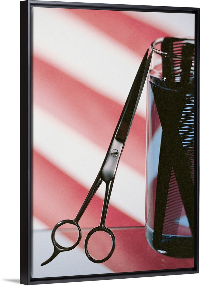 <p>Still life of barbershop pole with scissors and combs</p>