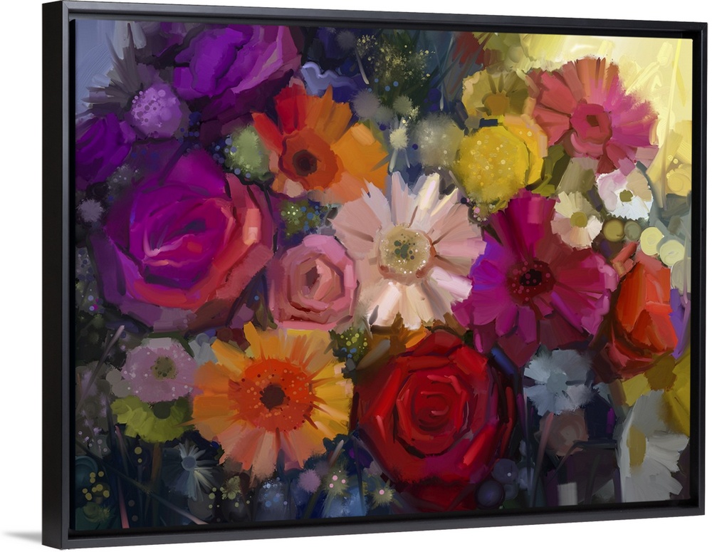 <p>Still life of yellow, red and pink color flower. Originally an oil painting of a colorful bouquet of rose, daisy and gerbera flowers. Originally hand painted florals in an impressionist style.</p>