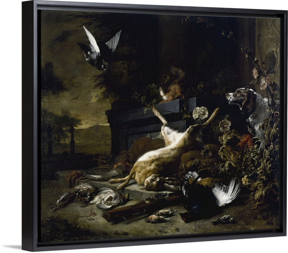 <p>Still Life Of Game Including A Hare, Black Grouse And Partridge, A Spaniel Looking On With A Pigeon In Flight, 1680 (Originally oil on canvas)</p>