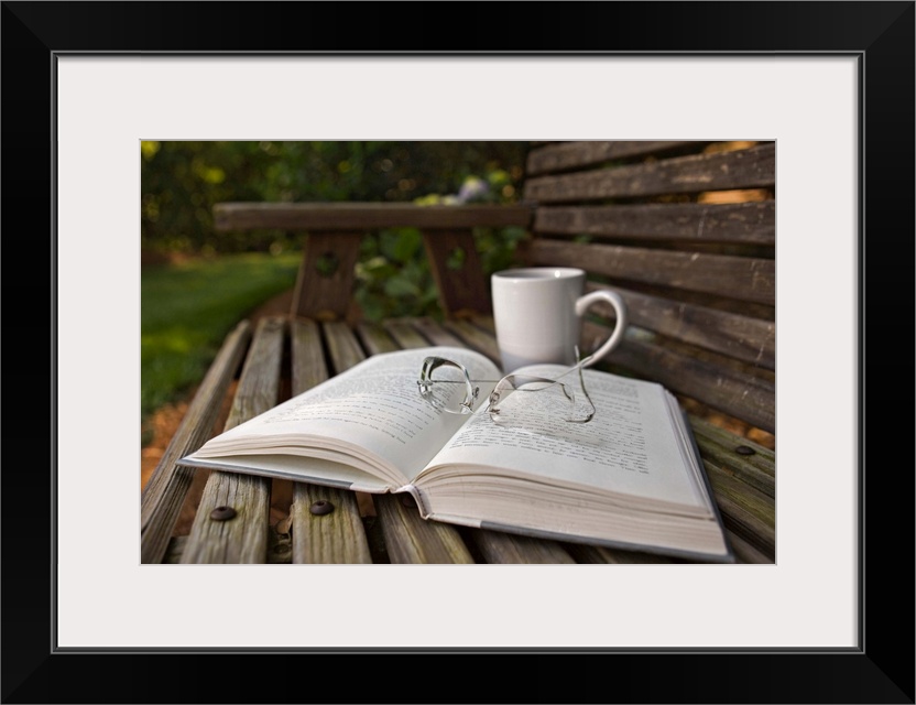 <p>Wall docor of glasses sitting on top of an open book with a coffee cup in the background on a bench.</p>