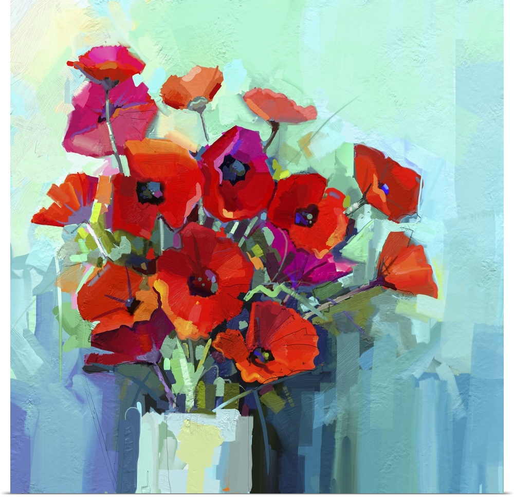 <p>Originally an oil painting - still life of red and pink color flower. Colorful bouquet of poppy flowers in vase. Color green and blue background. Originally hand painted floral in an impressionist style.</p>