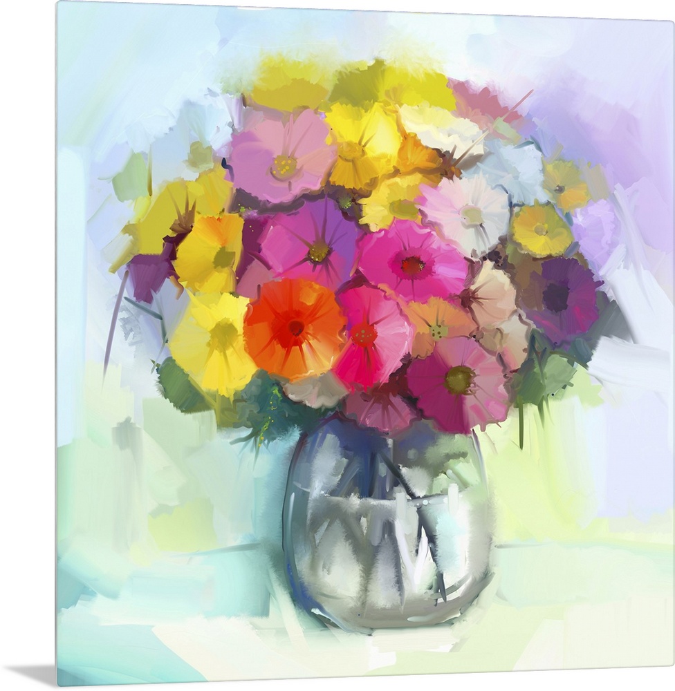 <p>Still life of yellow and red gerbera flowers. Originally an oil painting of a bouquet of flowers in glass vase. Originally hand painted florals in an impressionist style.</p>