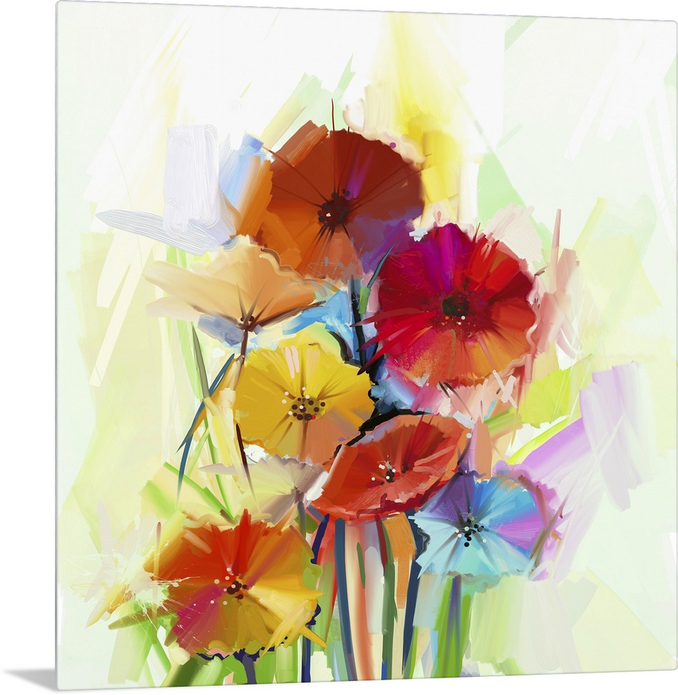 <p>Originally an abstract oil painting of spring flowers. Still life of yellow and red gerbera flowers. Originally hand painted florals in an impressionist style.</p>