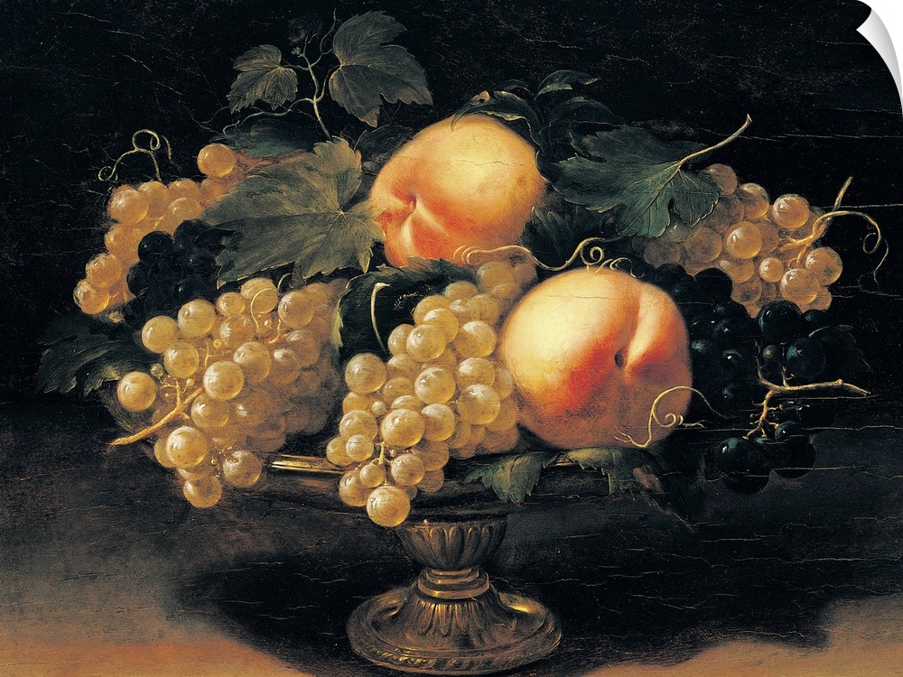 <p>Nuvolone Panfilo, Still Life with Peaches, White Grapes, Black Grapes, Vine Leaves and Metal Cup, 1620, 17th Century, oil on panel, Italy, Lombardy, formerly in Milan, private collection (65286) Everett Collection\Mondadori Portfolio</p>