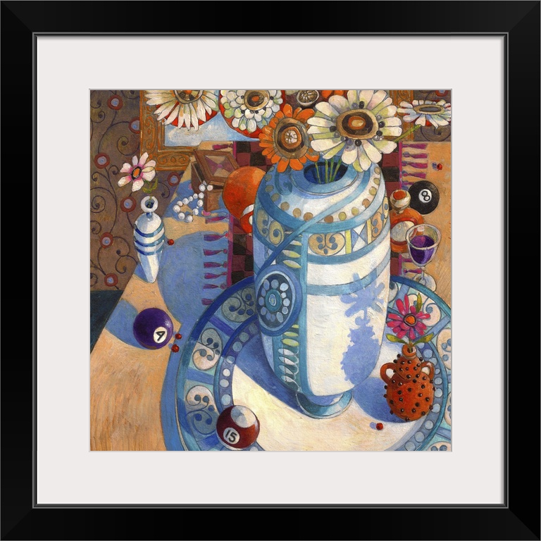 <p>Contemporary artwork of a still life of a vase and some flowers. With some billiard balls.</p>