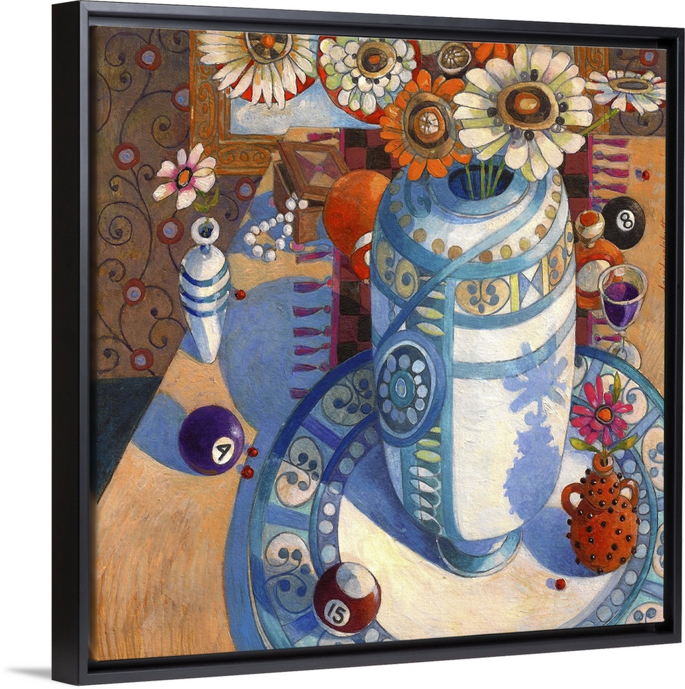 <p>Contemporary artwork of a still life of a vase and some flowers. With some billiard balls.</p>