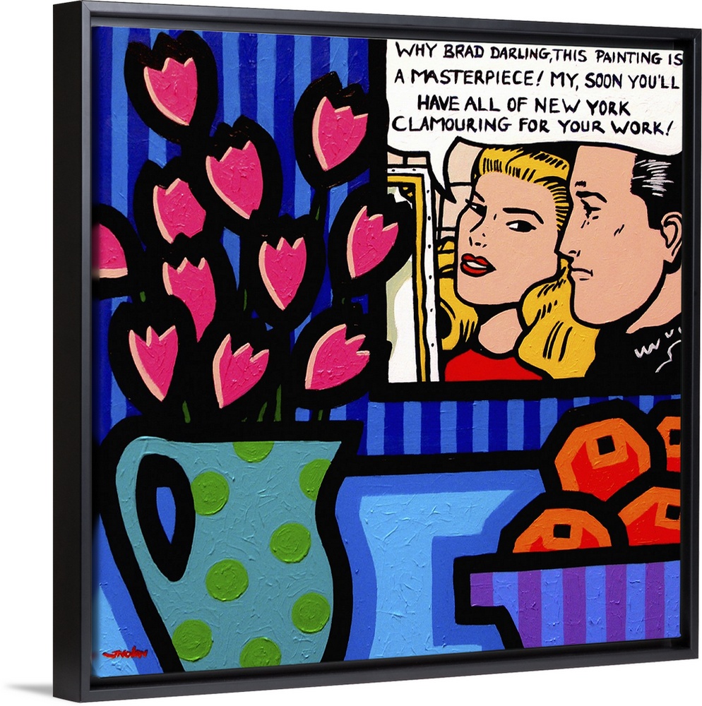 <p>Still Life With Lichtenstein, woman, fruit, flowers, comic</p>