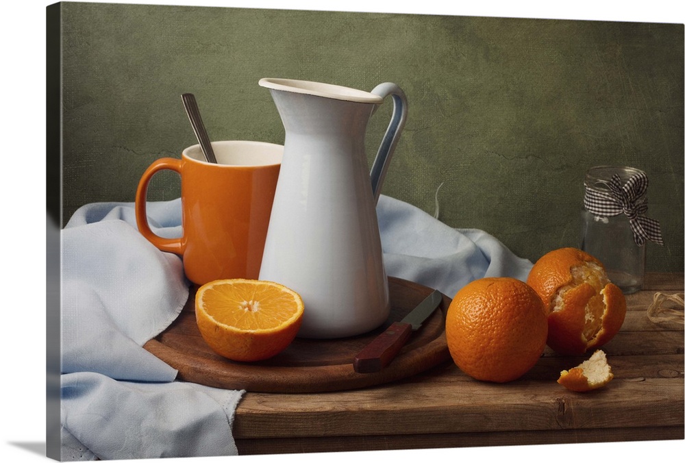 <p>Fine art artistic still life with tangerines and blue jug on wooden table over grunge green background</p>