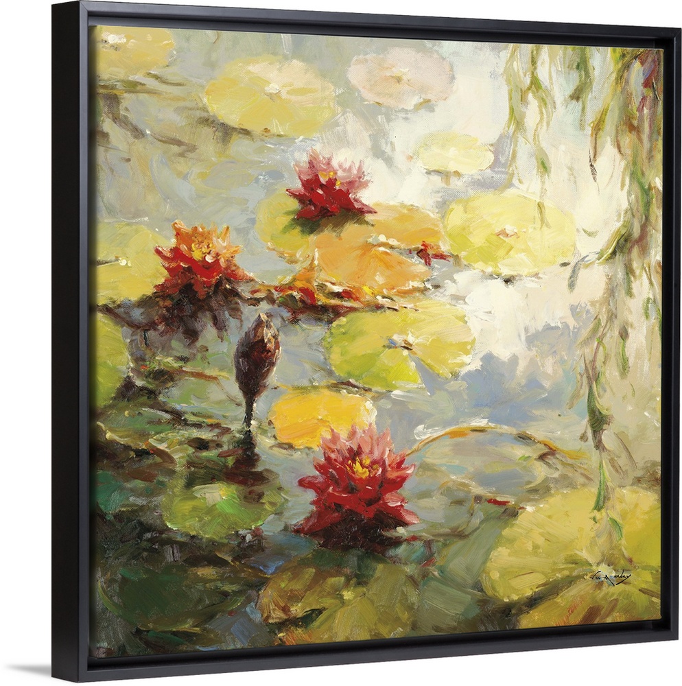 <p>Contemporary painting of several water lilies and lily pads floating in a pond.</p>