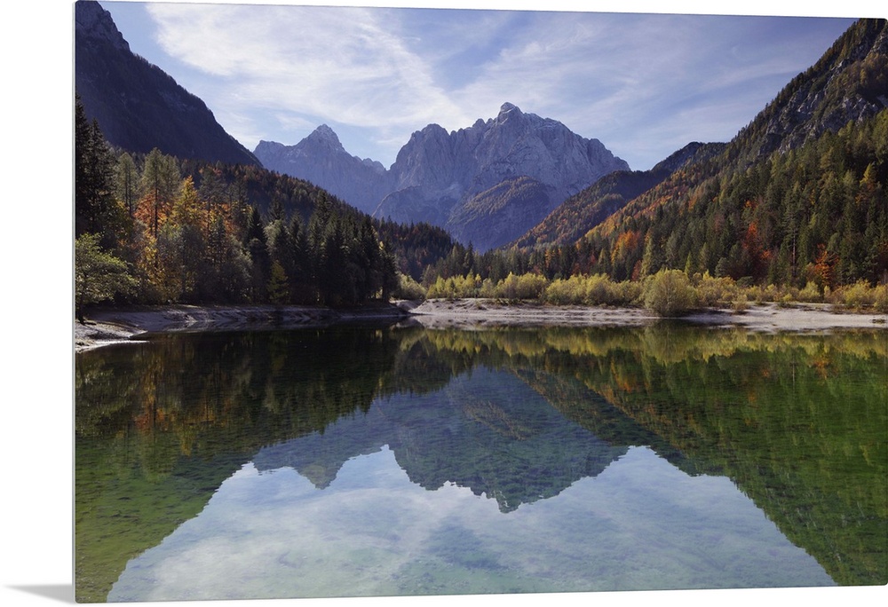 <p>Julian Alps, Peaks of Prisojnik and Razor reflected in pools beside the Velika Pisnca river in autumn.</p>
