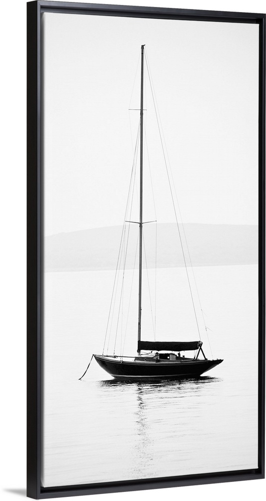 <p>Black and white photograph of a sailboat with its sail down on calm water.</p>