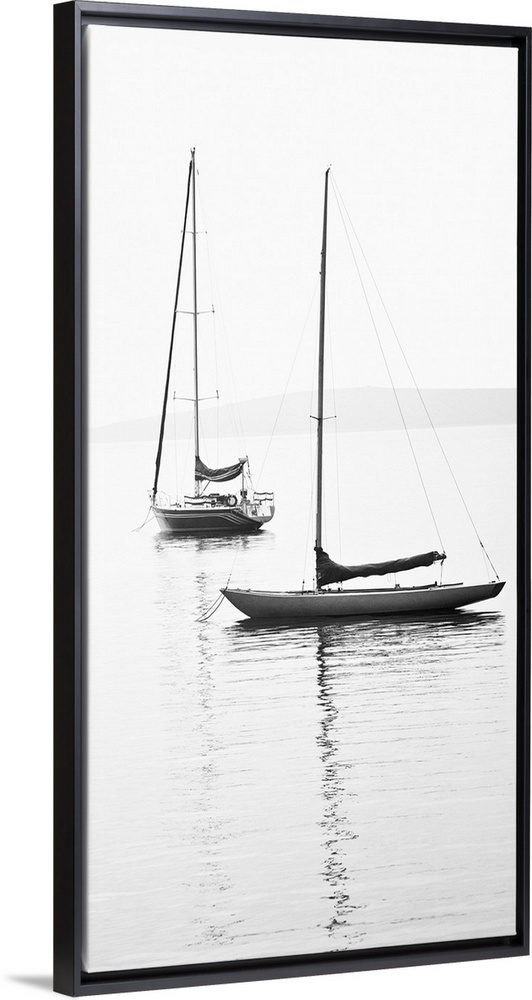 <p>Black and white photograph of two sailboats with sails down on calm water.</p>