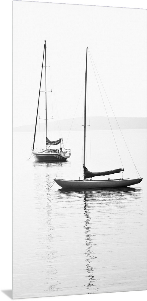 <p>Black and white photograph of two sailboats with sails down on calm water.</p>
