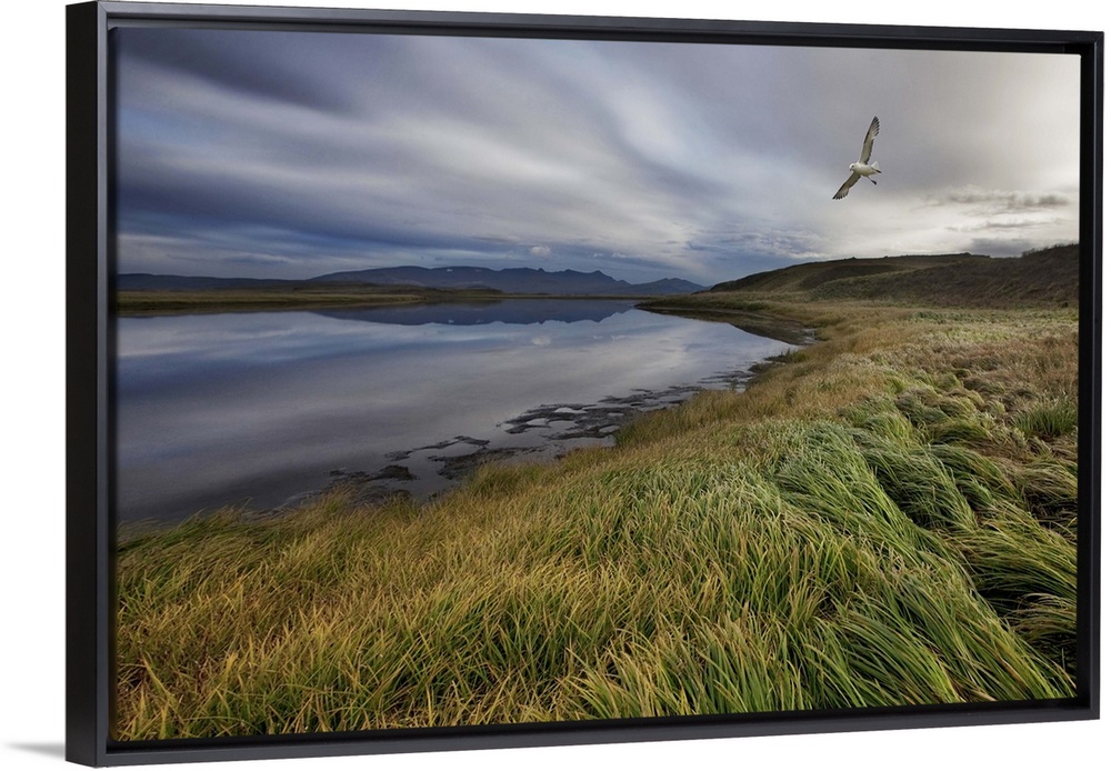 <p>A shore bird flies over a windswept Icelandic landscape.</p>