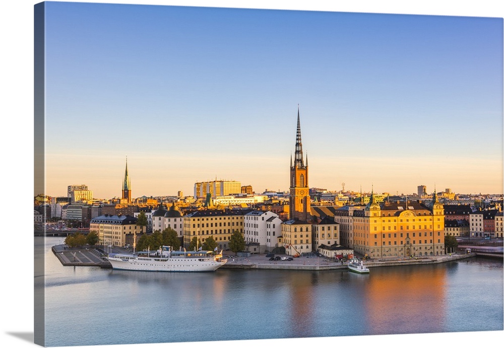 <p>Stockholm, Sweden, Northern Europe. High angle view over Riddarholmen and Riddarholmskyrkan (church) at sunrise.</p>