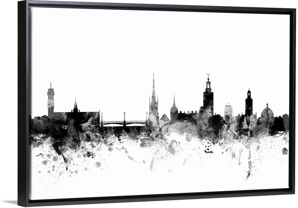 <p>Contemporary artwork of the Stockholm city skyline in black watercolor paint splashes.</p>