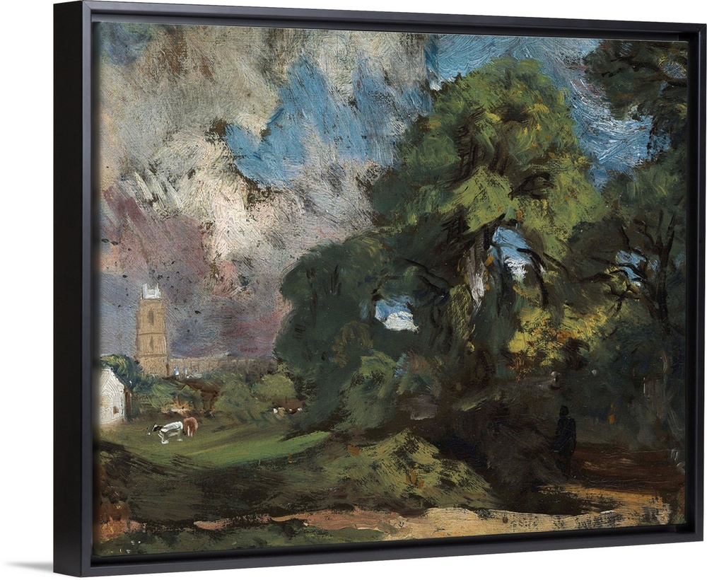 <p>This sketch was made in the Suffolk countryside, near the home of Constable's aunt. The view offers a glimpse of the quaint hamlet of Stoke and its church of Saint Mary the Virgin. In related versions of the scene (Tate Britain, London; Victoria and Albert Museum, London), the figure standing in deep shadow on the roadway is replaced by a woman in white carrying a brightly colored bundle.</p>