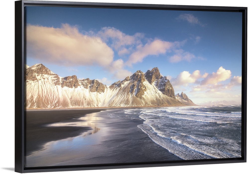 <p>Sunny blue sky over Vestrahorn, seen from the black sandy beach, Stokksnes, Iceland.</p>