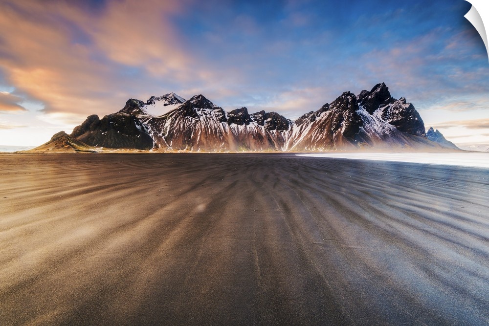 <p>Stokksnes, Hofn, East Iceland, Iceland. Vestrahorn mountain and the black sand beach at sunset.</p>