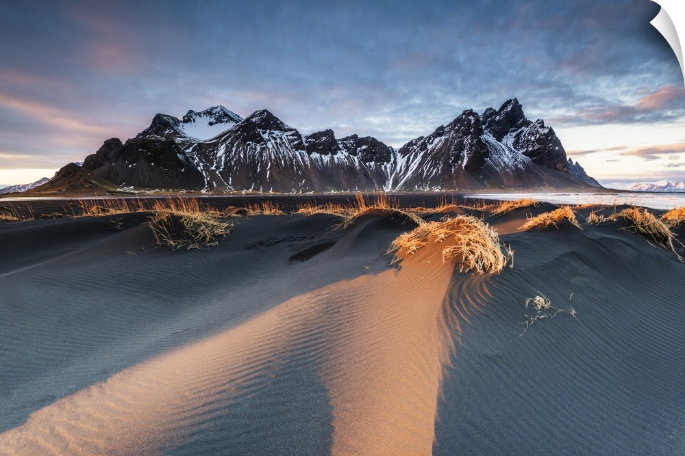 <p>Stokksnes, Hofn, East Iceland, Iceland. Vestrahorn mountain and the black sand dunes at sunset.</p>