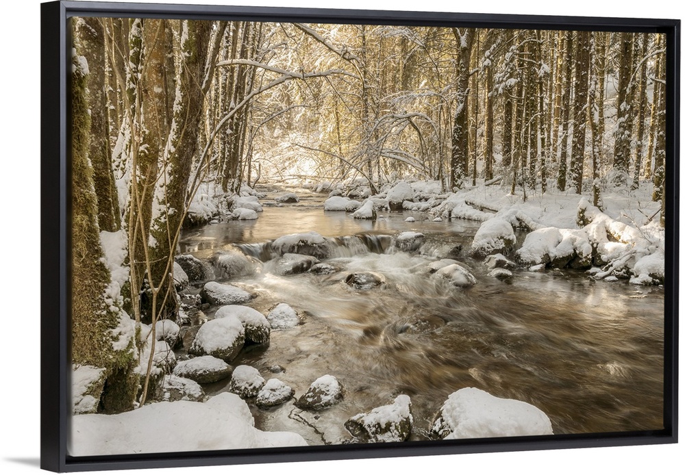 <p>Photograph of a rushing river in the middle of snow covered woods at golden hour.</p>