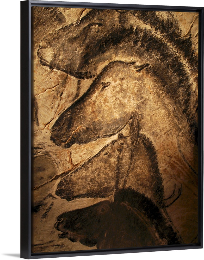 <p>Stone-age cave paintings. Artwork of horses painted on the wall of a cave. These paintings are found in the Chauvet Cave, France, the site of the earliest known cave paintings (as of 2011), which have been dated to between 32,900 and 30,000 years ago.</p>