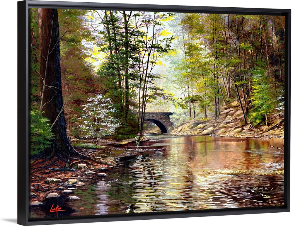 <p>Contemporary painting of a shallow river flowing calmly through a forest.</p>