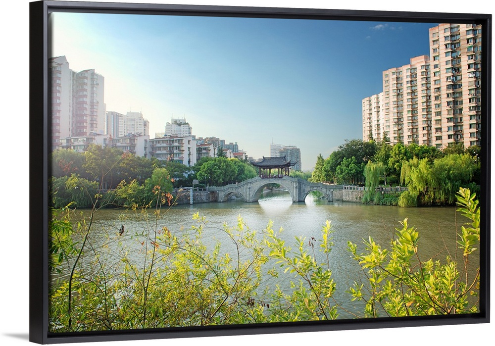 <p>Stone bridge with pagoda style roofing, flanked by old style apartment buildings on the left and newer ones on the right, Hangzhou, China</p>