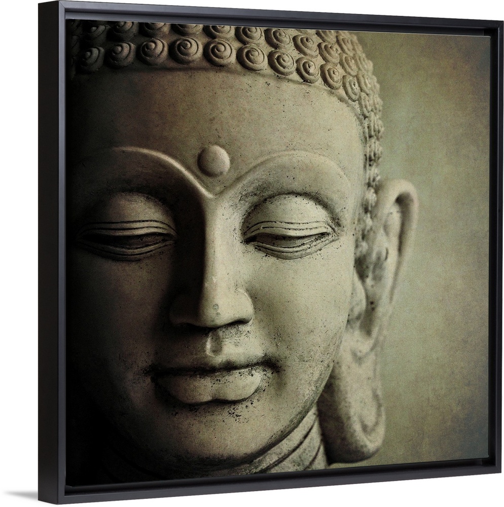 <p>Close up photo of the face of a sculpture of Buddha, showing his downcast eyes and tight curls in his hair.</p>