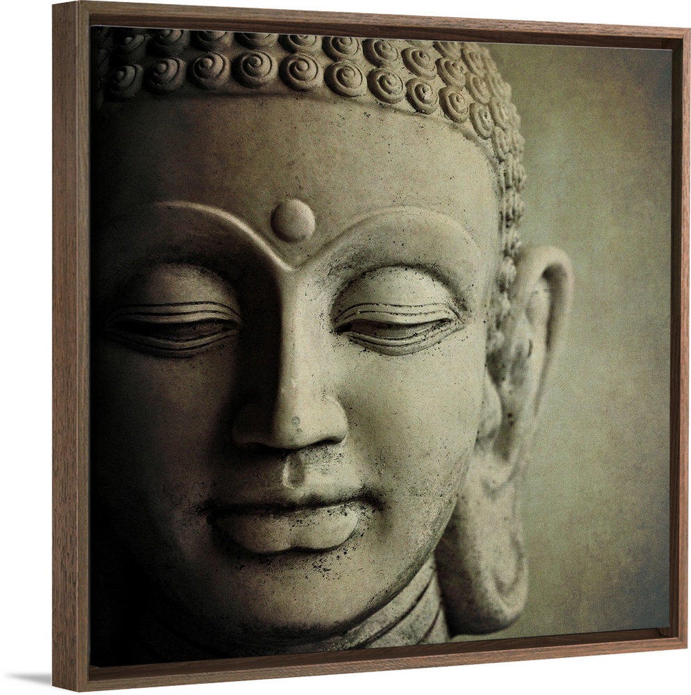 <p>Close up photo of the face of a sculpture of Buddha, showing his downcast eyes and tight curls in his hair.</p>