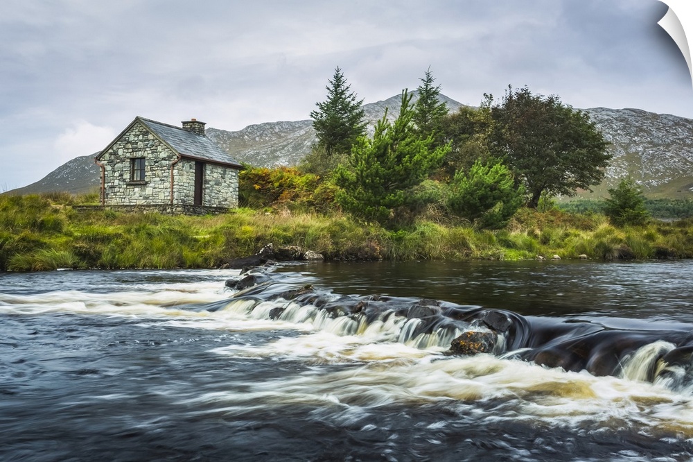 <p>Small stone fisherman's hut on the banks of a small river with mountains in the background on a cloudy day; Connemara, County Galway, Ireland.</p>