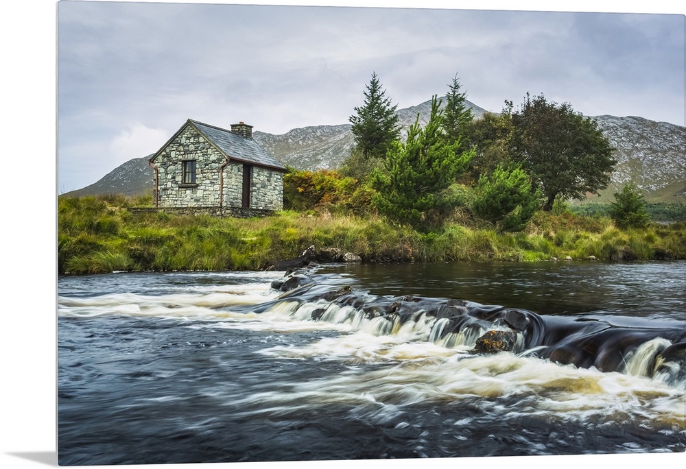 <p>Small stone fisherman's hut on the banks of a small river with mountains in the background on a cloudy day; Connemara, County Galway, Ireland.</p>